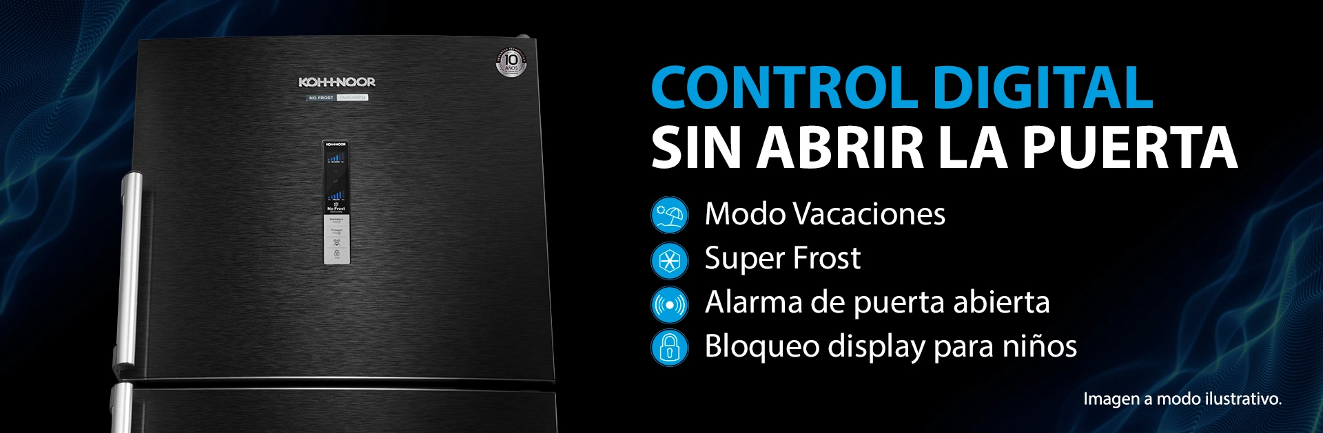 También cuenta con ¡CON CONTROL DIGITAL en puerta!, que te permite hacer todo sin necesidad de abrirla. Configurá el nivel de temperatura, enfría rápidamente la temperatura del freezer con la función Super Frost, ahorrá energía con la función Vacaciones, ya que te permite apagar la heladera y dejar sólo el freezer en funcionamiento. Además podés Bloquear el display y mantener seguro el frío de los más chicos. Y Alarma de Puerta Abierta , que te avisa si queda abierta evitando que tus alimentos pierdan frío.