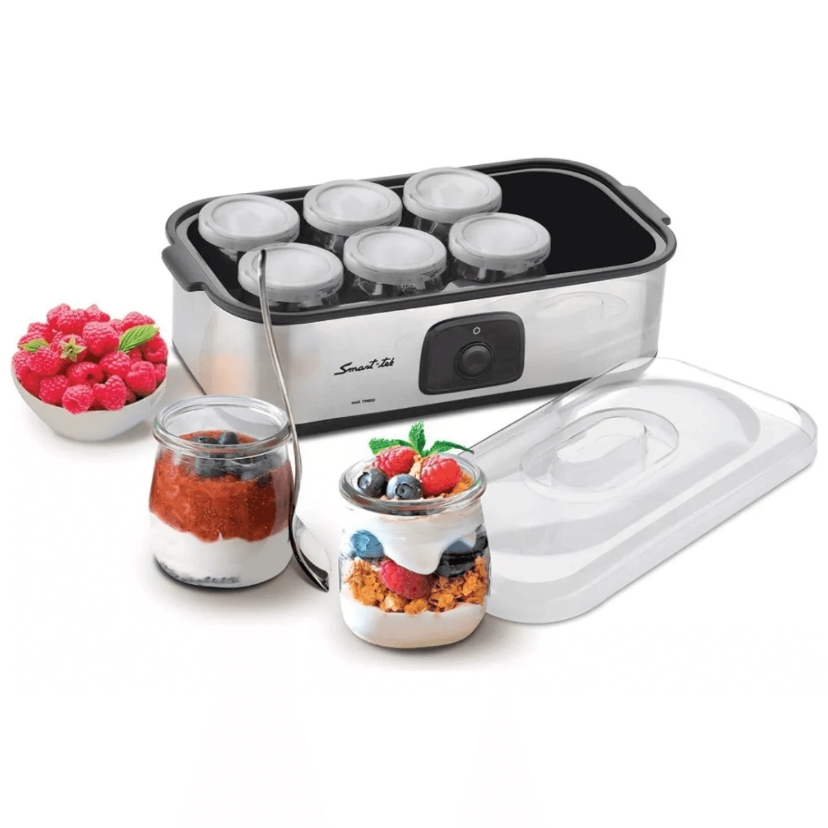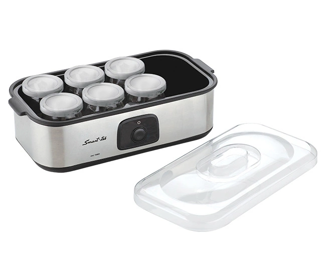 La Yogurtera YM800 presenta un elegante cuerpo de acero inoxidable y tapa transparente, combinando estilo con funcionalidad. Con capacidad para 8 frascos de vidrio de 180 ml cada uno, ofrece suficiente volumen para preparar porciones individuales o para toda la familia